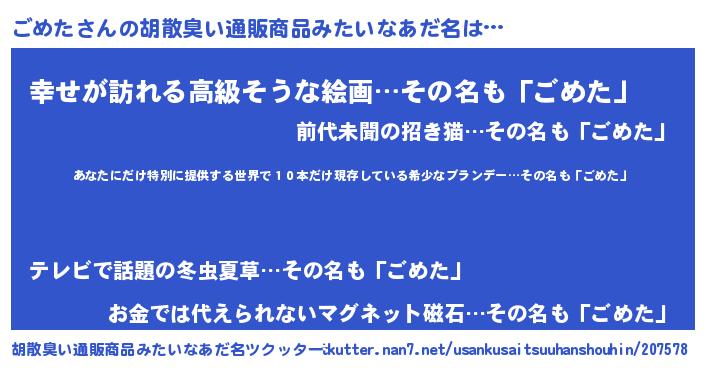 | 男性向けラノベタイトル風あだ名 | 『この素晴らしい世界にごめたを!』 |