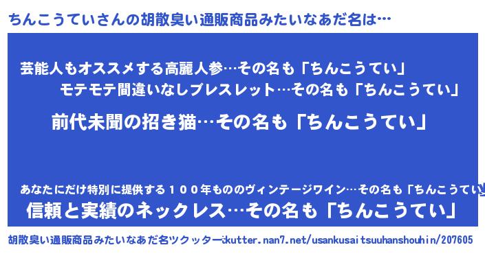 | ヘコむあだ名 | 『ちんこうてい(小並感)』『ちんを』 |