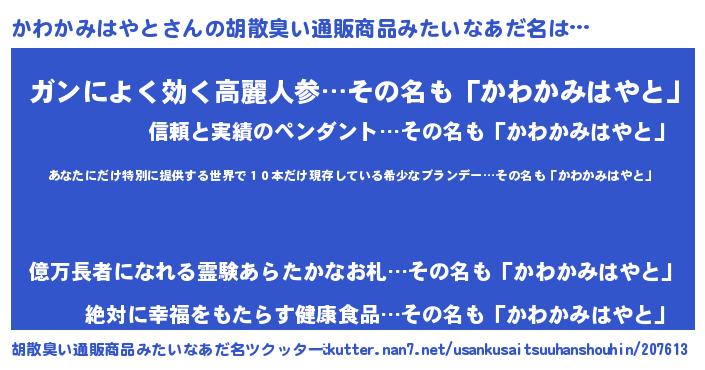 | 意味不明あだ名 | 『住所不定無職かわかみはやと(86歳)』 |