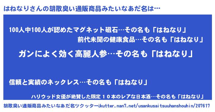 | ヘコむあだ名 | 『はねなり(小並感)』『はね太郎』 |