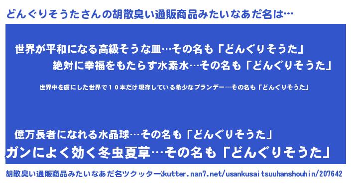 | 男性向けラノベタイトル風あだ名 | 『この素晴らしい世界にどんぐりそうたを!』 |