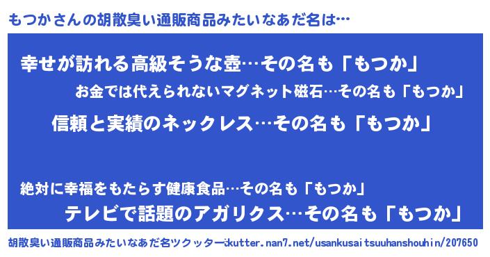 | 意味不明あだ名 | 『とにかく怪しいもつか』『自称もつか』 |