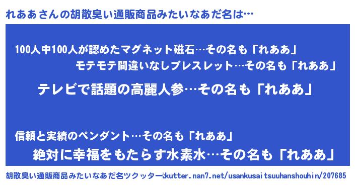 | ヘコむあだ名 | 『れああ(小並感)』『れあにー』 |