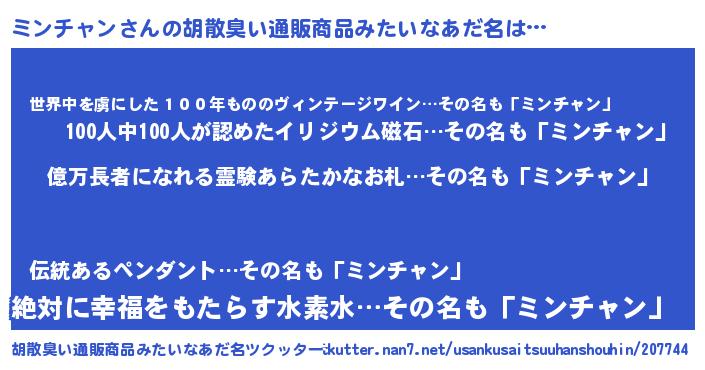 | ヘコむあだ名 | 『ミンっふぃ~』『ミンチャン(笑)』 |