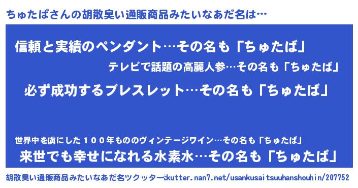 | 男性向けラノベタイトル風あだ名 | 『緋弾のチュタバ』『ちゅたばの憂鬱』 |