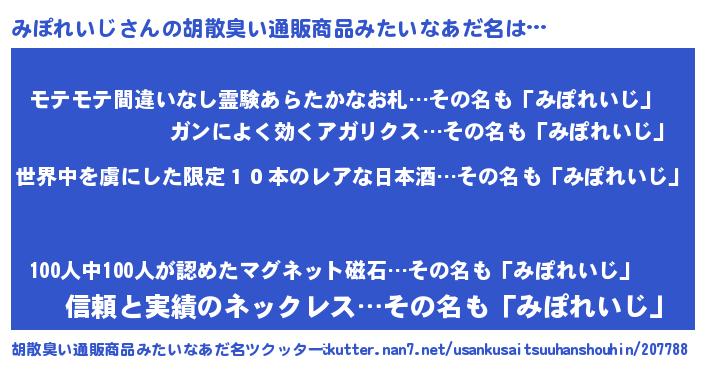 | 意味不明あだ名 | 『住所不定無職みぽれいじ(68歳)』 |