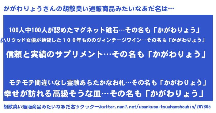 | 意味不明あだ名 | 『とにかく怪しいかがわりょう』 |