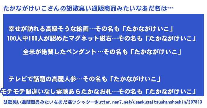 | 男性向けラノベタイトル風あだ名 | 『たかながけいこの嫁は女の子じゃないと思った?』 |