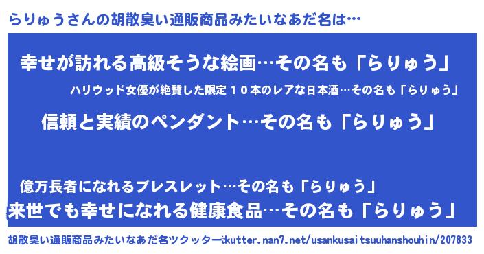 | 男性向けラノベタイトル風あだ名 | 『ラリュウスレイヤー』 |