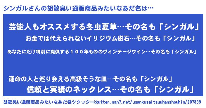 | 意味不明あだ名 | 『つくし科シンガル属』『自称シンガル』 |