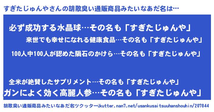 | 男性向けラノベタイトル風あだ名 | 『おまえをオタクにしてやるから、俺をすぎたじゅんやにしてくれ! 』 |