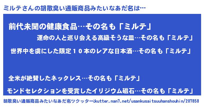 | 意味不明あだ名 | 『住所不定無職ミルテ(59歳)』 |