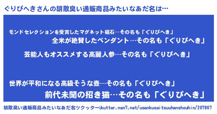 | 男性向けラノベタイトル風あだ名 | 『Re:ぐりぴへきから始める異世界生活』 |