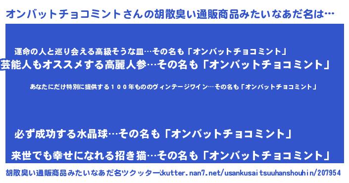 | 男性向けラノベタイトル風あだ名 | 『この素晴らしい世界にオンバットチョコミントを!』 |