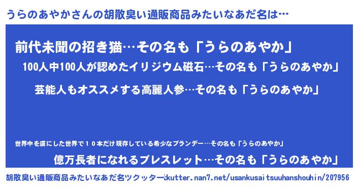 | 肩書あだ名 | 『うらのあやか閣下』『うらのあやか先生』 |