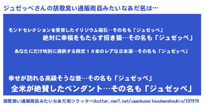| 男性向けラノベタイトル風あだ名 | 『うちのジュゼッペが世界を掌握している!』 |