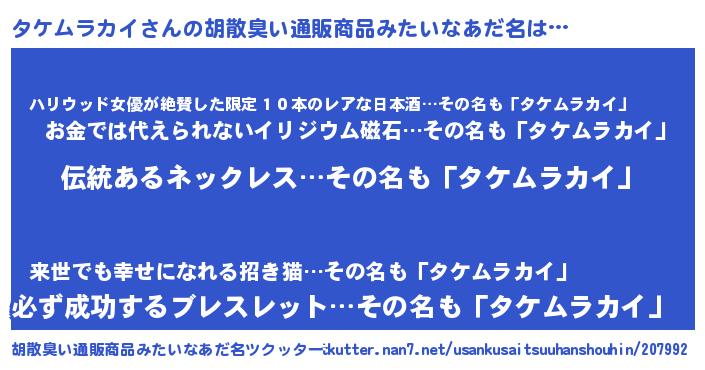| 男性向けラノベタイトル風あだ名 | 『転生したらタケムラカイだった件』 |