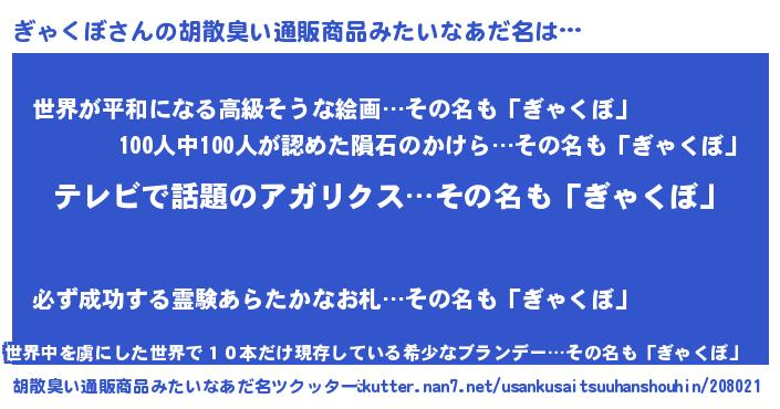| 男性向けラノベタイトル風あだ名 | 『転生したらぎゃくぼだった件』 |