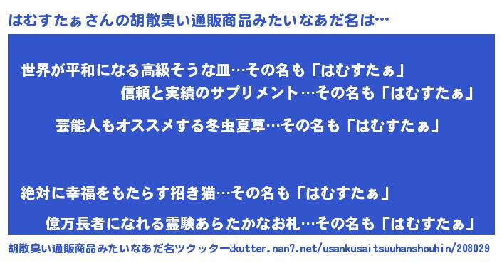 | 男性向けラノベタイトル風あだ名 | 『Re:はむすたぁから始める異世界生活』 |