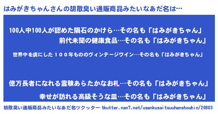 | 意味不明あだ名 | 『住所不定無職はみがきちゃん(8歳)』 |