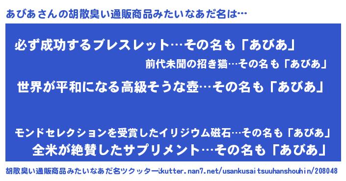 | ヘコむあだ名 | 『なまこ酢』『あびふぇ~』『あびを』 |