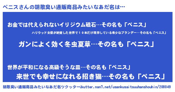 | ヘコむあだ名 | 『ペニス(遠い目)』『なまこ酢』 |