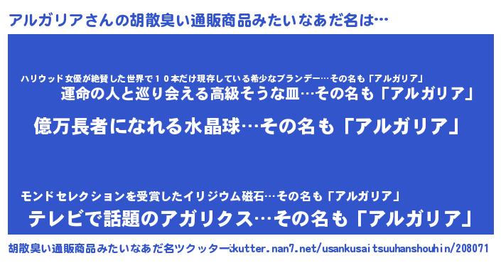 | 意味不明あだ名 | 『ペロリンアルガリア』『自称アルガリア』 |