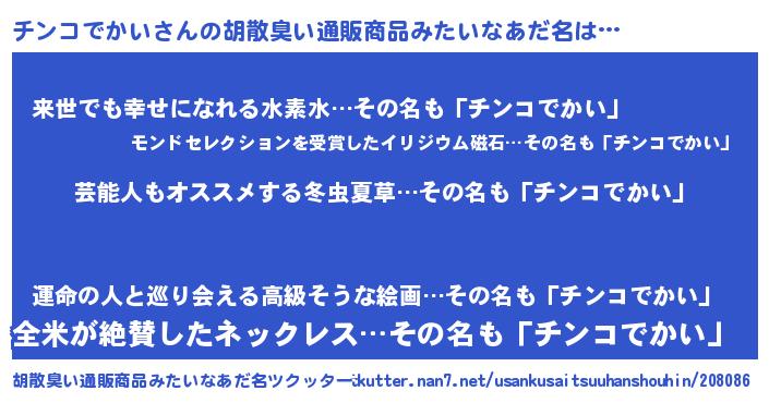 | 男性向けラノベタイトル風あだ名 | 『チンコでかい~年齢イコール彼女いない歴の魔法使い~』 |