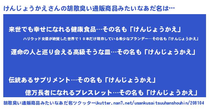 | 男性向けラノベタイトル風あだ名 | 『けんじょうかえ~年齢イコール彼女いない歴の魔法使い~』 |