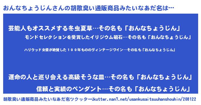 | 意味不明あだ名 | 『住所不定無職おんなちょうじん(5歳)』 |