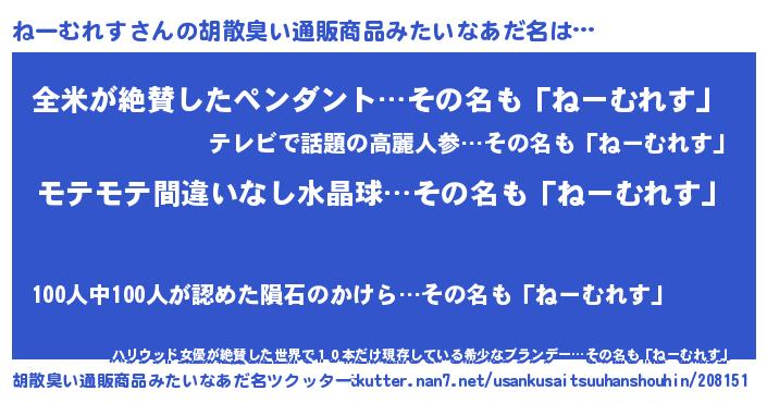 | 女子向けラノベタイトル風あだ名 | 『ねーむれすの玉の輿計画!』 |