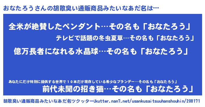 | 男性向けラノベタイトル風あだ名 | 『オナタロウアートオンライン』 |
