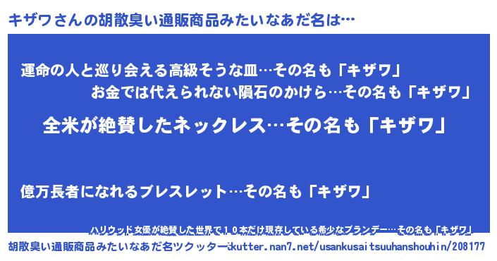 | 男性向けラノベタイトル風あだ名 | 『キザワの嫁は女の子じゃないと思った?』 |