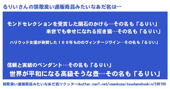 | 男性向けラノベタイトル風あだ名 | 『ルリイスレイヤー』『魔弾の王とるりい』 |