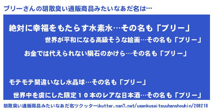 | 女子向けラノベタイトル風あだ名 | 『ブリー恋絵巻』『ブリーの玉の輿計画!』 |