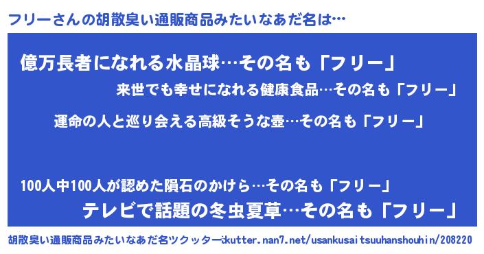 | 男性向けラノベタイトル風あだ名 | 『フリーに滅ぼされるだけの簡単なお仕事です』 |