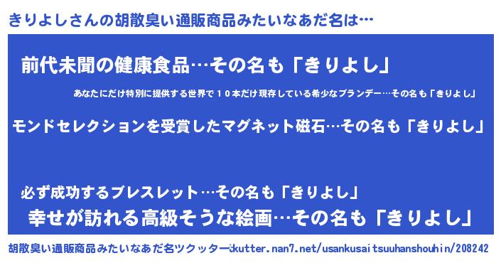 | 男性向けラノベタイトル風あだ名 | 『うちのきりよしが世界を掌握している!』 |