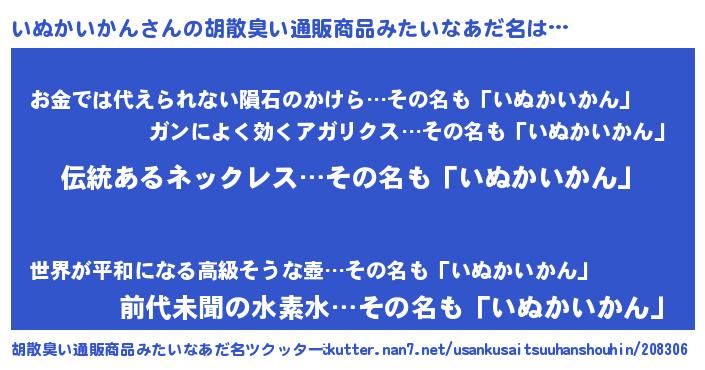 | 男性向けラノベタイトル風あだ名 | 『いぬかいかんの嫁は女の子じゃないと思った?』 |