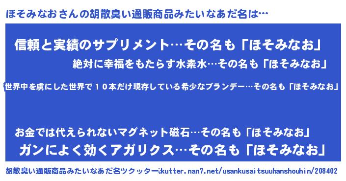 | 男性向けラノベタイトル風あだ名 | 『この素晴らしい世界にほそみなおを!』 |