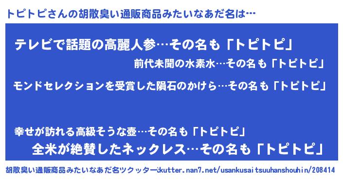 | 男性向けラノベタイトル風あだ名 | 『トピトピに滅ぼされるだけの簡単なお仕事です』 |
