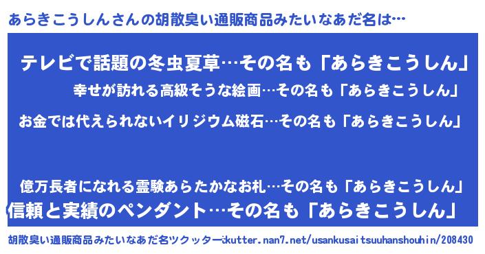 | ヘコむあだ名 | 『あら太郎』『なまこ酢』『あらにー』 |