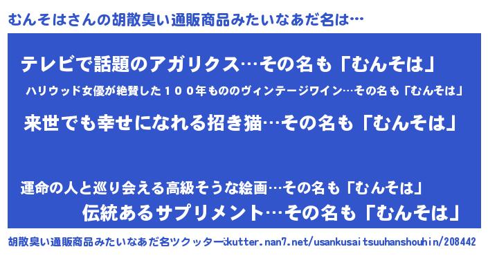 | 男性向けラノベタイトル風あだ名 | 『むんそはという概念が存在しない退屈な世界 』 |