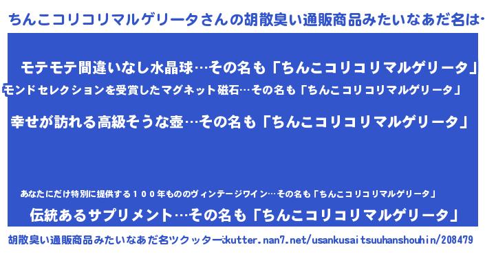 | 女子向けラノベタイトル風あだ名 | 『ちんこコリコリマルゲリータの雑貨屋さん』 |