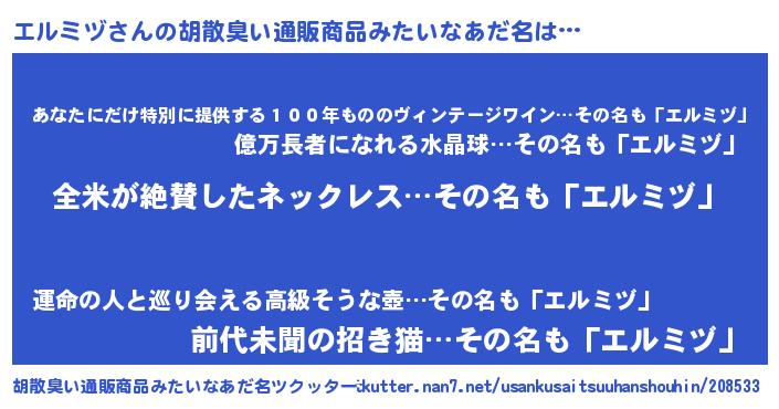 | 男性向けラノベタイトル風あだ名 | 『エルミヅ~年齢イコール彼女いない歴の魔法使い~』 |