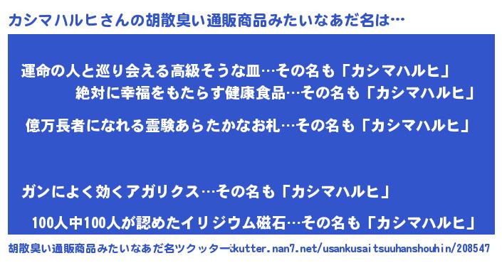 | 恥ずかしいあだ名 | 『プリティーカシマハルヒ』『カシっちょ』 |