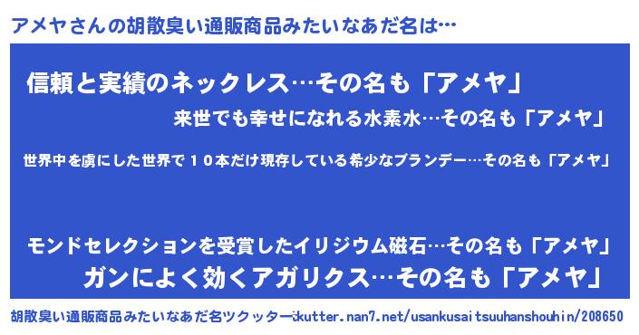 | 意味不明あだ名 | 『住所不定無職アメヤ(77歳)』『自称アメヤ』 |
