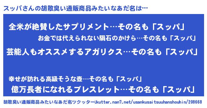 | 男性向けラノベタイトル風あだ名 | 『スッパに滅ぼされるだけの簡単なお仕事です』 |