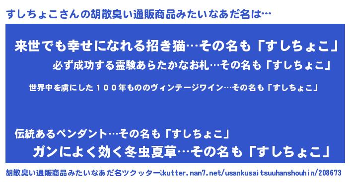 | 男性向けラノベタイトル風あだ名 | 『転生したらすしちょこだった件』 |