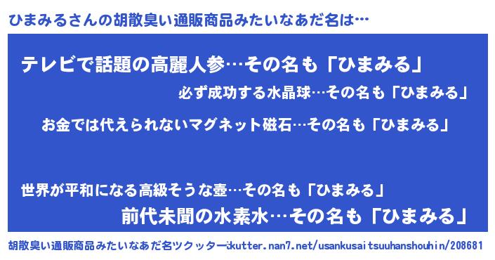 | 男性向けラノベタイトル風あだ名 | 『ひまみるに滅ぼされるだけの簡単なお仕事です』 |