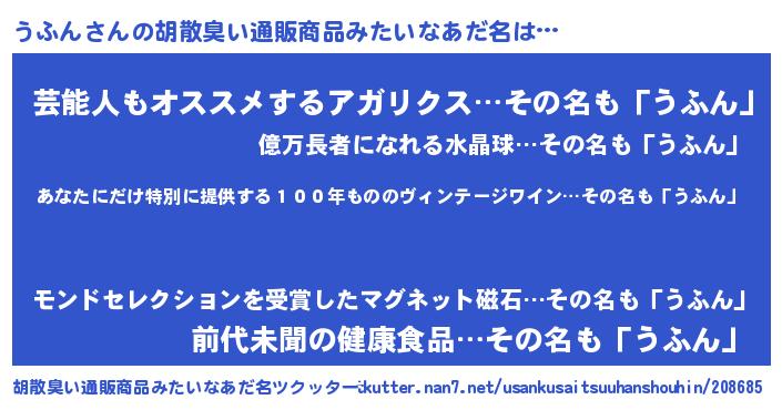 | 意味不明あだ名 | 『住所不定無職うふん(8歳)』『自称うふん』 |